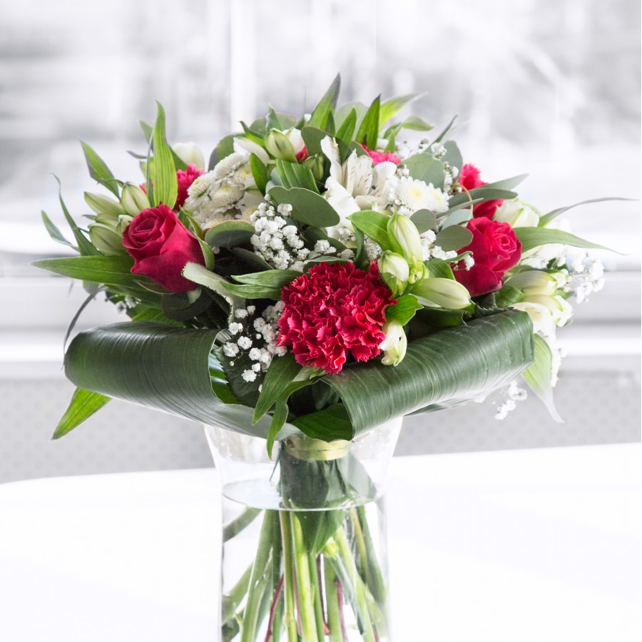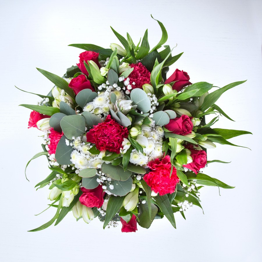 Embrace the timeless elegance of our unique bouquet, expertly designed to inspire and captivate. This exquisite arrangement features lush red roses paired with sweet white chrysanthemums and airy gypsophila, enhanced by vibrant carnations and pristine white alstroemeria. The addition of aspidistra leaves brings depth and sophistication to the overall design.