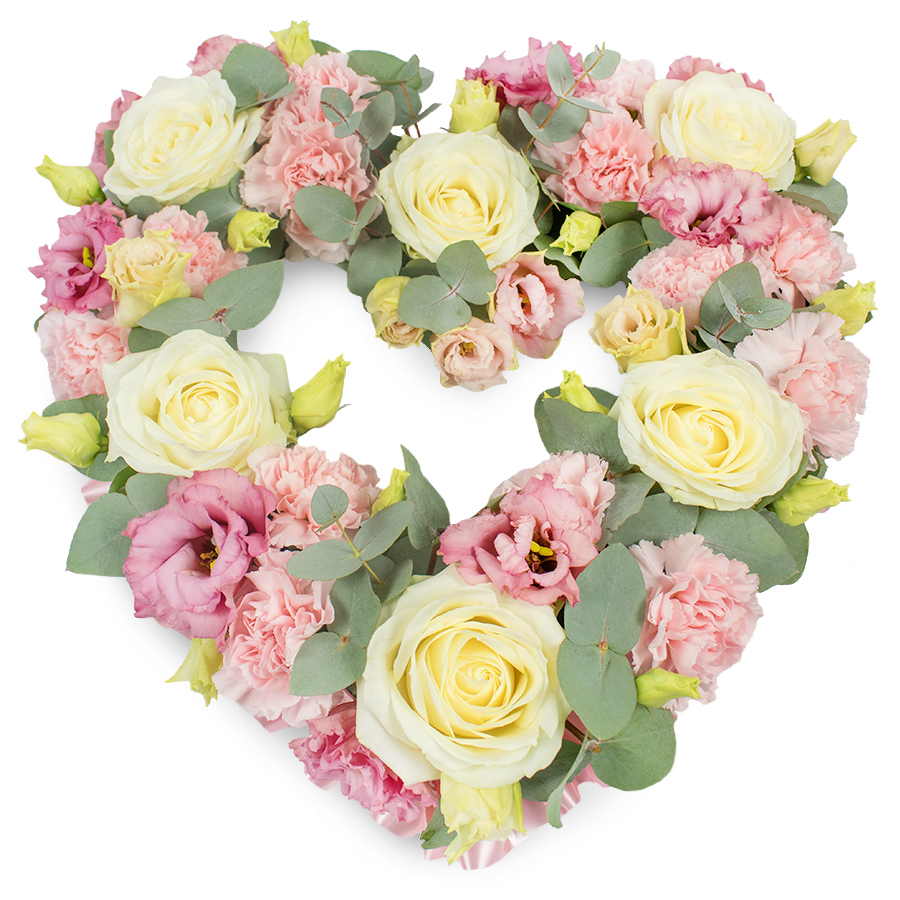 Express your sincere gratitude and remembrance with our charming tribute flower arrangement. This elegant bouquet features a harmonious blend of white roses, pink carnations, pink lisianthus, and eucalyptus leaves, all hand-selected to ensure the freshest and most beautiful presentation.